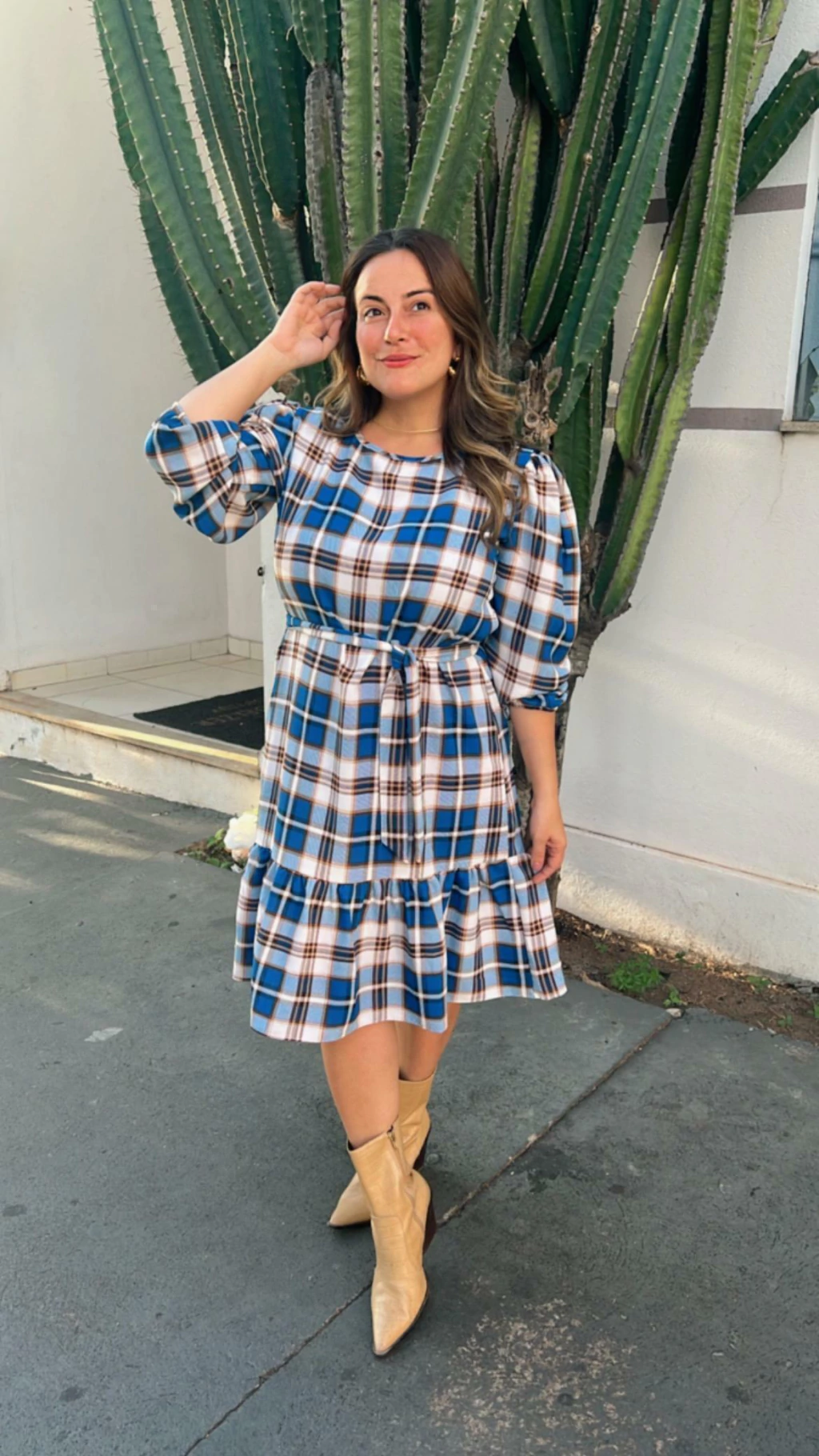 Descubra o charme irresistível do Vestido Xadrez de Manga Longa com Babado na Barra, a peça perfeita para quem deseja um visual que combina clássico e delicadeza com toque moderno.